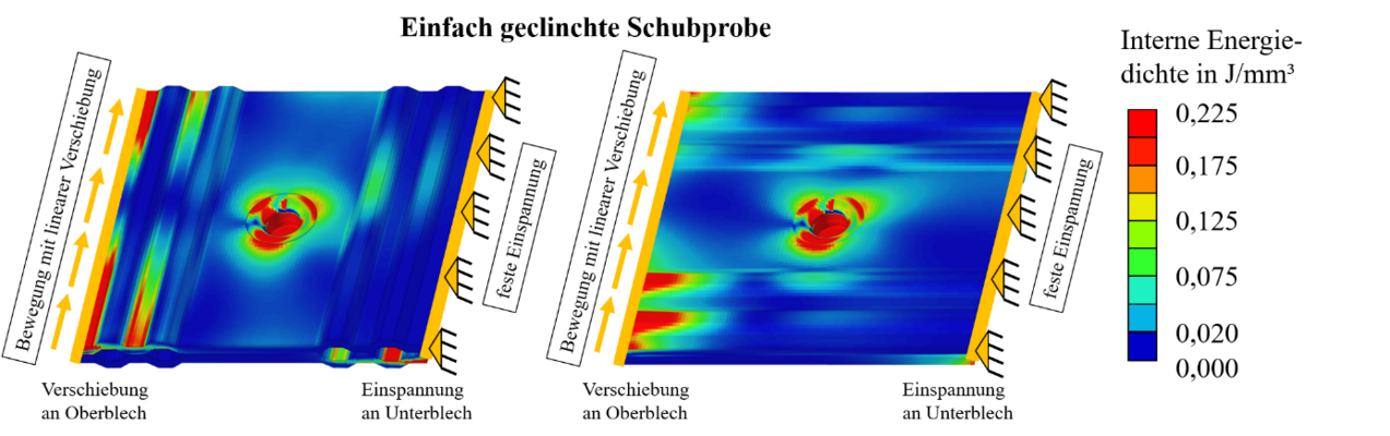 Soll die Sicherheit einer Fügeverbindung prognostiziert werden, ist ein Verständnis der existierenden Wechselwirkungen unabdingbar. Ist darüber hinaus eine Vorhersage für ein Gesamtbauteil oder eine Fügeverbindung in einer Struktur zu treffen, ist das Verständnis der Zusammenhänge zwischen der Bauteilstruktur und der Belastung eines einzelnen Fügepunkts erforderlich. In einem gefügten Bauteil ist die Belastung in einem einzelnen Fügepunkt von den Eigenschaften des Fügeelementes, des Fügedesigns, sowie von den Bauteileigenschaften und der Lasteinleitung abhängig. Das Fügedesign ist die Summe aller Fügeelemente, deren Eigenschaften sowie deren Position. Durch Änderungen am Fügepunkt oder durch eine andere Positionierung der Fügepunkte verändert sich die Belastung in diesen. Die Fügesicherheit muss nach einer solchen Änderung für jeden Punkt weiterhin gewährleistet sein. Die im Rahmen dieses Teilprojektes zu entwickelnde Auslegungsmethodik soll dies gewährleisten, indem ein gefügtes Bauteil entweder von der Gesamtstruktur kommend (Top-Down) oder von der Fügestelle kommend (Bottom-Up) ausgelegt wird. Durch die zu entwickelnde methodische Vorgehensweise und die dafür adaptierten und neuartigen Analysemethoden soll eine gleichmäßige Lastverteilung in Fügestelle und Bauteil realisiert werden. Die Ermittlung der Beanspruchung in Bauteil und Fügeelement erfolgt anhand von Energie- und Spannungsgrößen und mithilfe der entwickelten Kraftflussmethode. Anhand einer Fahrzeugkarosserie erfolgt die Ermittlung von typischen Belastungsarten von Clinchpunkten. Die Betrachtung des Einflusses prozessbedingter und werkstoffbedingter Störgrößen erfolgt durch eine numerische und experimentelle Sensitivitätsanalyse. Durch die Veränderungen der Fügepunktumgebung besteht die Möglichkeit diese Umverteilung zu beeinflussen. Die Wechselwirkung zwischen Geometrie und Fügepunkten konnte experimentell und simulativ anhand von Schubproben nachgewiesen werden. Die Umlagerung kann beispielsweise anhand von Energie- und Spannungsgrößen inkrementell über den Umfang oder anhand des Kraftflusses dargestellt und analysiert werden. Damit werden Ursache-Wirkungs-Beziehungen zwischen den einzelnen Einflussgrößen und den Bauteil- und Fügestellenbeanspruchungen sichtbar und quantifizierbar. Die entwickelte Methode kann anschließend genutzt werden um in einer sich wandelnden Prozesskette einfache Anpassungen auf Basis der Struktur oder der Fügestelle vorzugeben, zu bewerten und damit die Fügesicherheit weiterhin zu gewährleisten.
